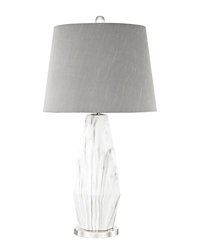 - Design details: ceramic, metal base; faux silk gray shade; requires 9.5-watt LED bulbs; bulbs included